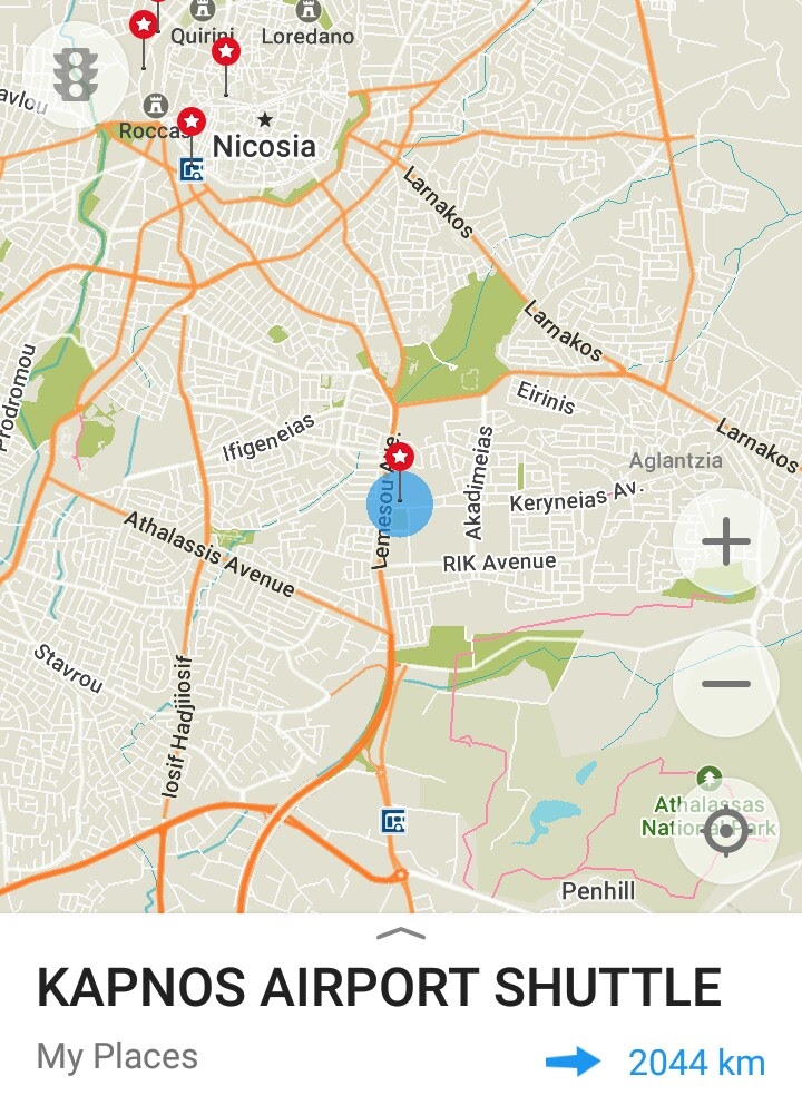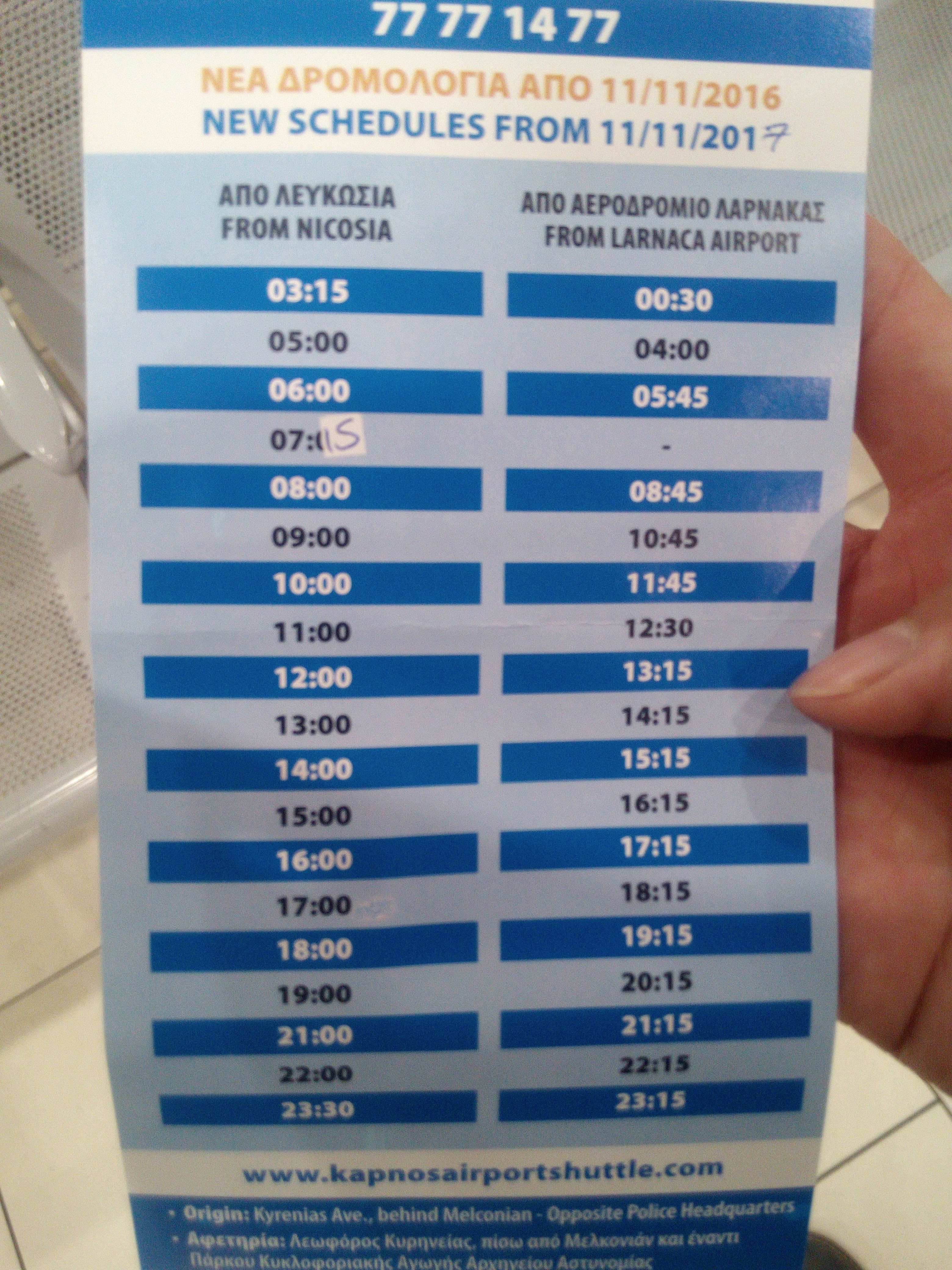 ただし!このシャトルバスはニコシアまで行かず、「KAPNOS」というシャトルバス停までしか行かないので、そのバス停から少し歩いて市内バスに乗り換え、ニコシアの「Solomou Square」まで行く必要があります。