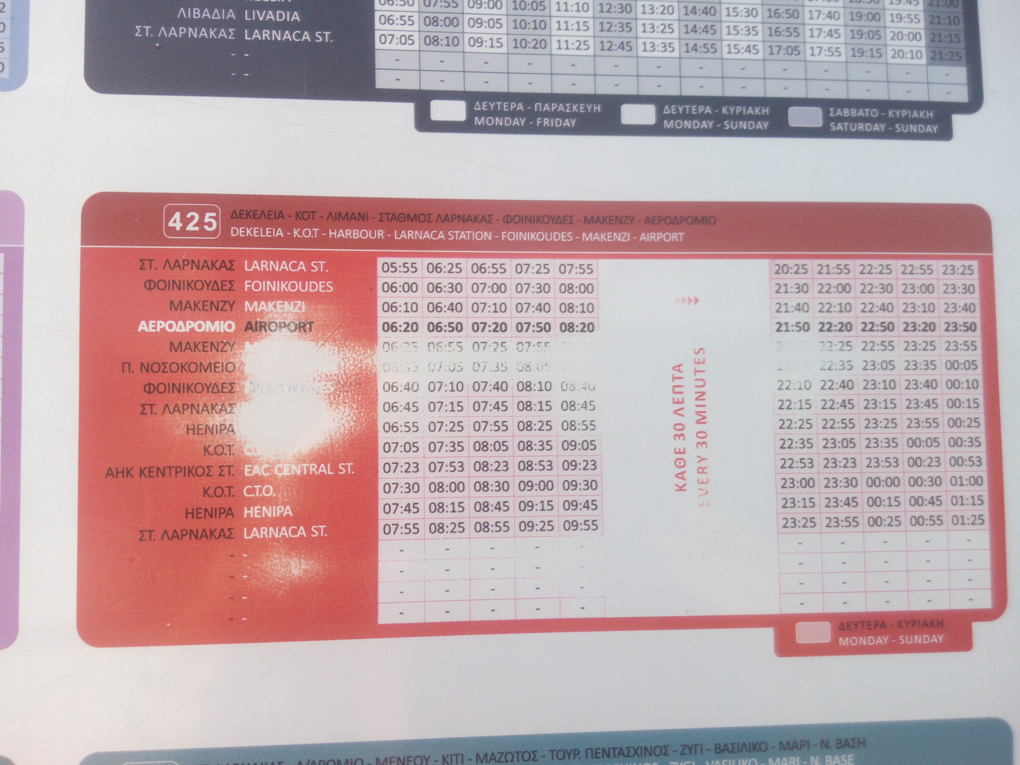 帰りはラルナカ市内から同じく425番のバスで空港まで行けます。空港に行かないバスもあるようなので、運転手に確認したほうがいいです。