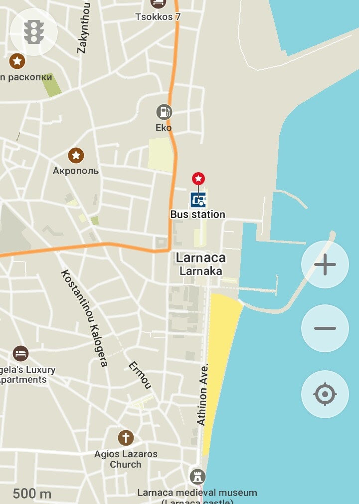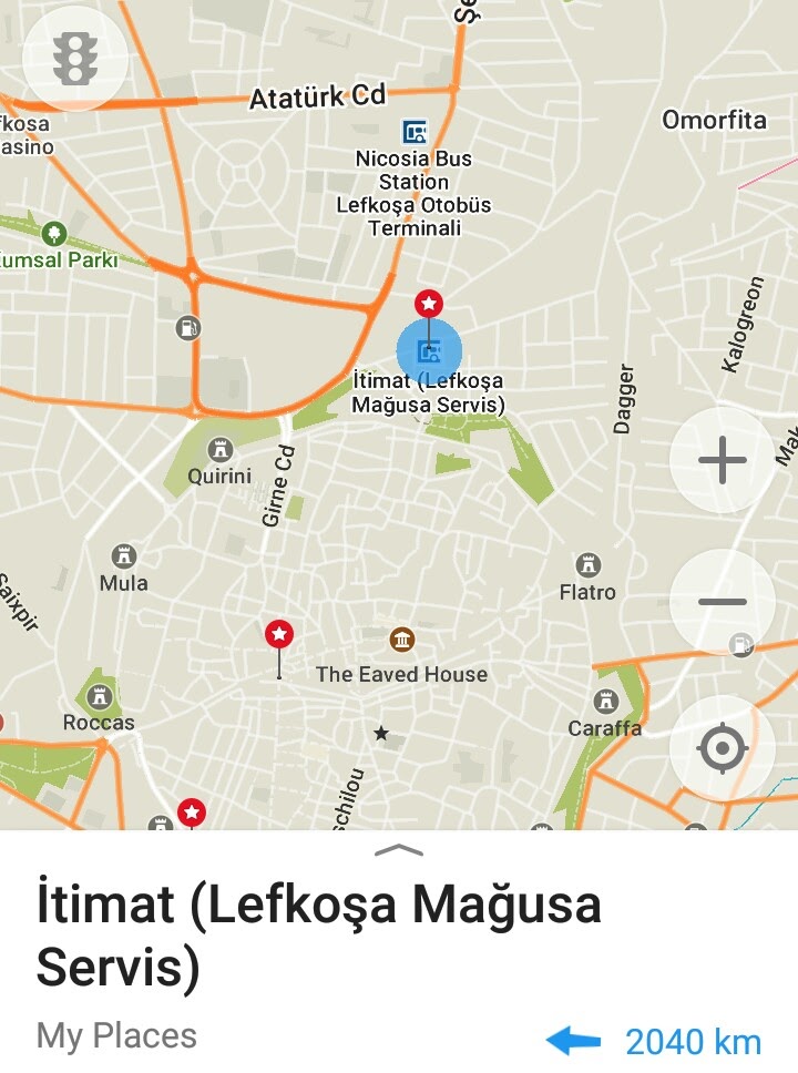 ピンはファマグスタ行きのバス停。ギルネ行きは歩いてすぐの別の場所になります。