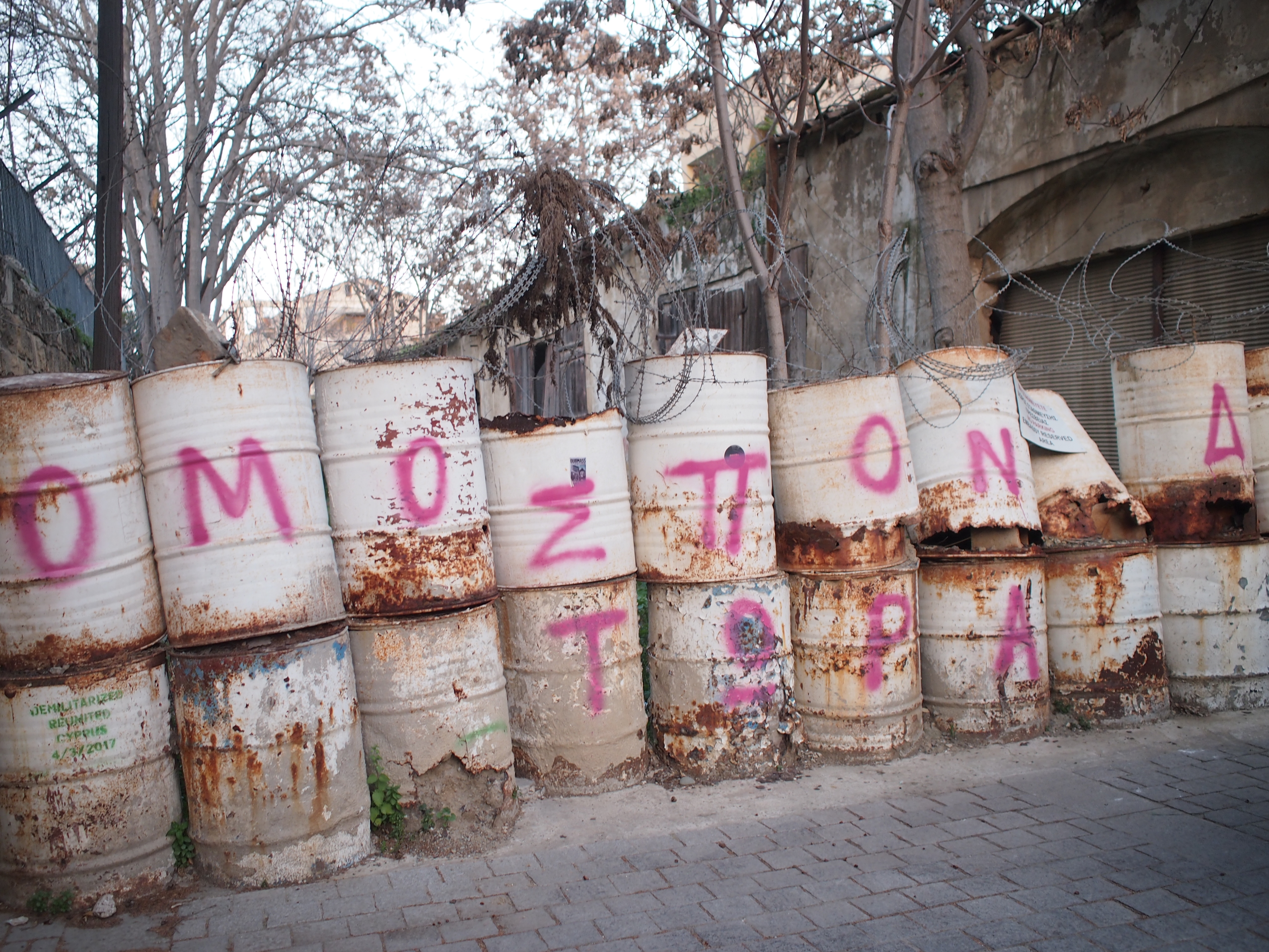 国境に沿って建物があって、元々自由に通れた道だったんだろうなって所は、ドラム缶とかでバリケードされてました。