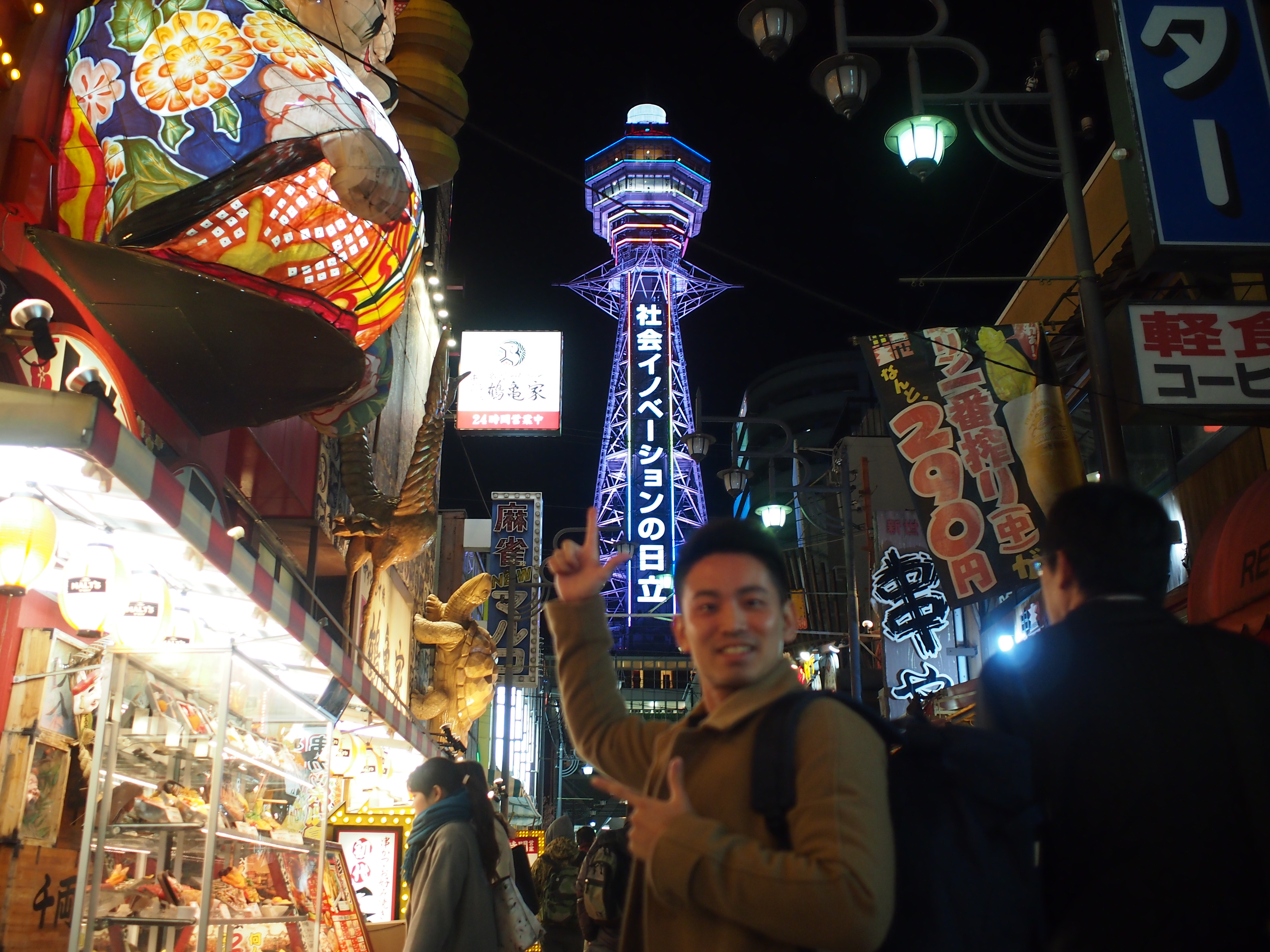 安っぽい通天閣のライトアップを1分くらい楽しみ、みんなの元へと。(写真ブレててごめんなさい。。)