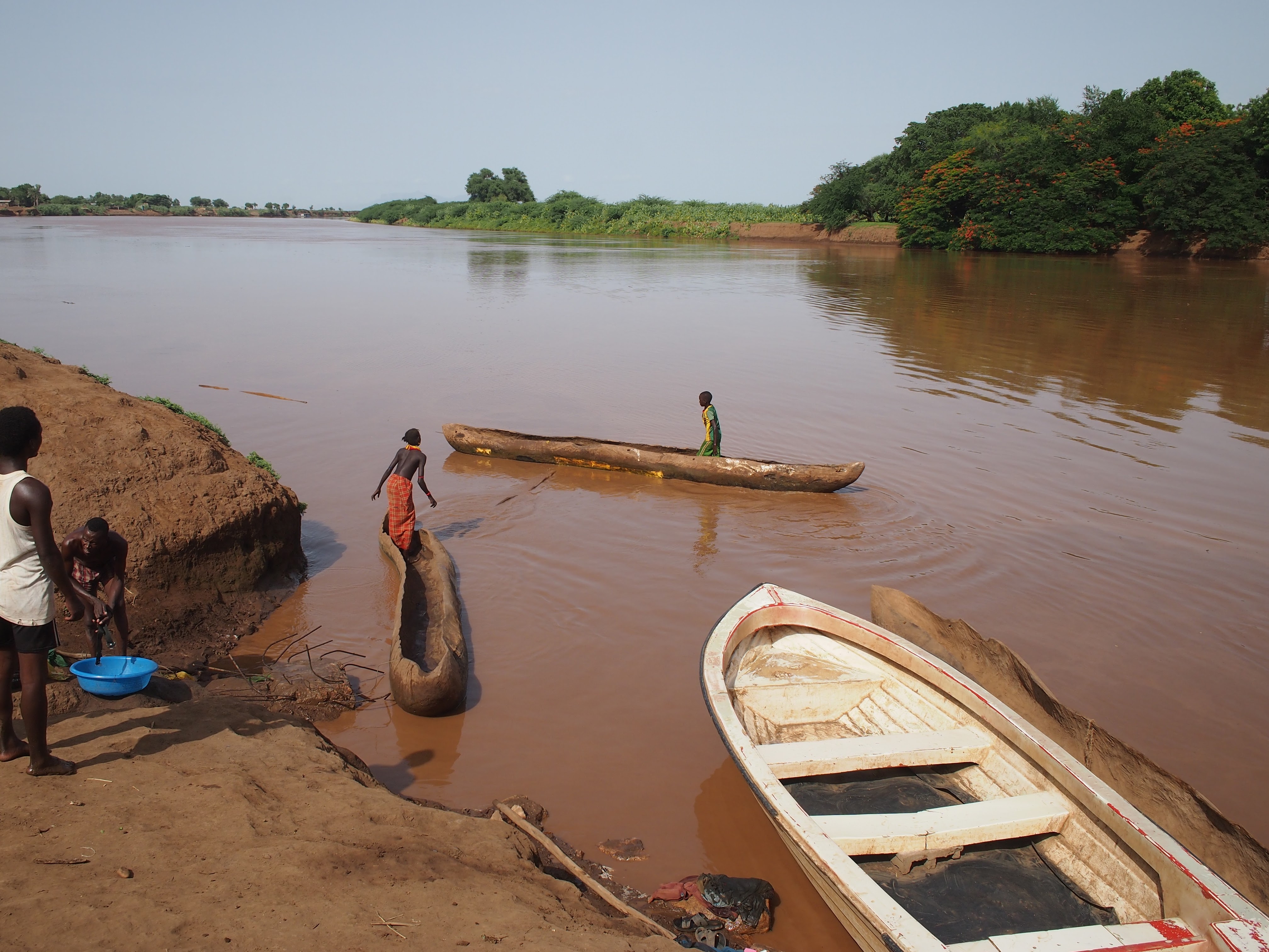 木を削って作った今にも沈みそうなボートに乗せてもらい、その対岸の奥にあるダサネチ族の村まで行ってきました。